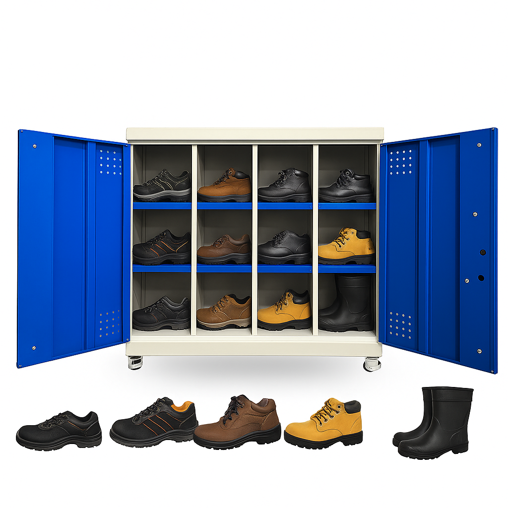 - Ngăn chứa: Tủ được thiết kế với 12 ngăn riêng biệt cho giày bảo hộ lao động, giúp tổ chức và bảo quản giày một cách hiệu quả. Đây là tủ giày bảo vệ lý tưởng cho việc lưu trữ các loại giày an toàn.